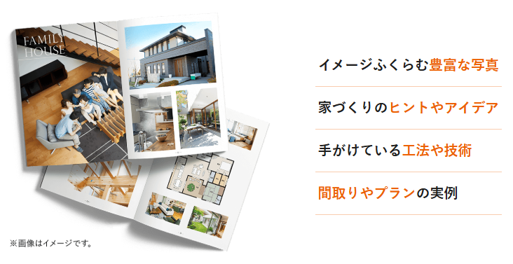 → 自社の家づくりへのこだわり、強み、過去の建築実績をまとめたパンフレット。